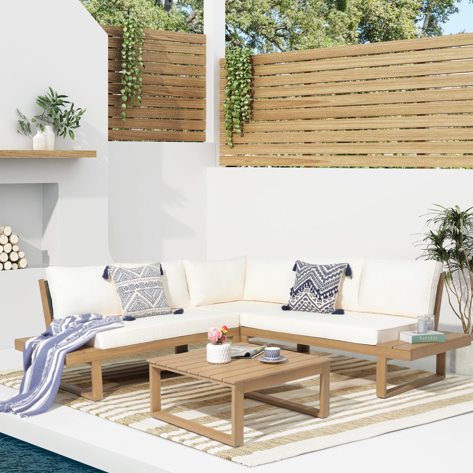 - COMFORT UPGRADE -With clean, precise lines, our modular sectional sofa is the ideal modern accessory for your outdoor space. Wooden frame with woven string backrest, this wood outdoor furniture not only offers a chic appearance but also provides stable structure.