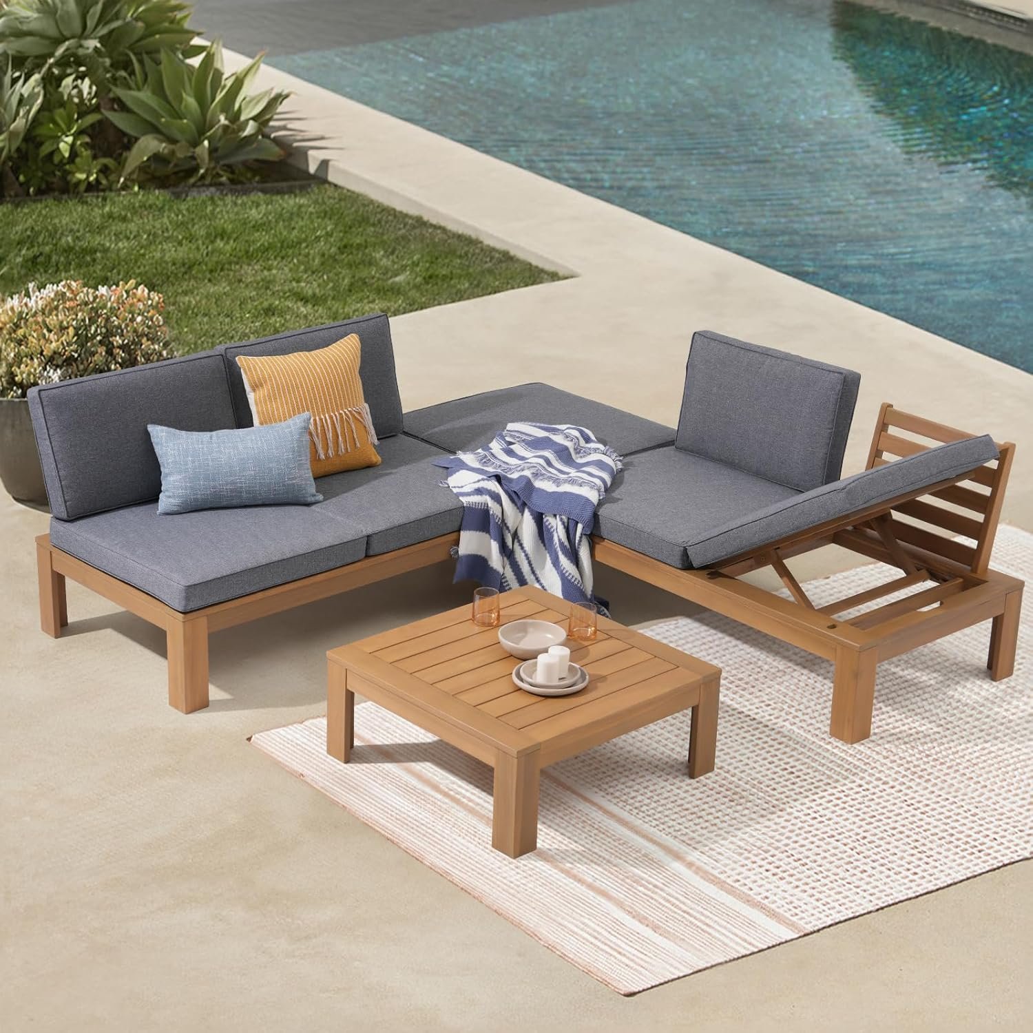 - 2-in-1 Wood Coffee Table: The coffee table comes with a cushion that can be used as an ottoman for foot rest, offering added comfort while lounging in the sun or enjoying a leisurely conversation. enhancing the overall experience of your modular patio sofa.