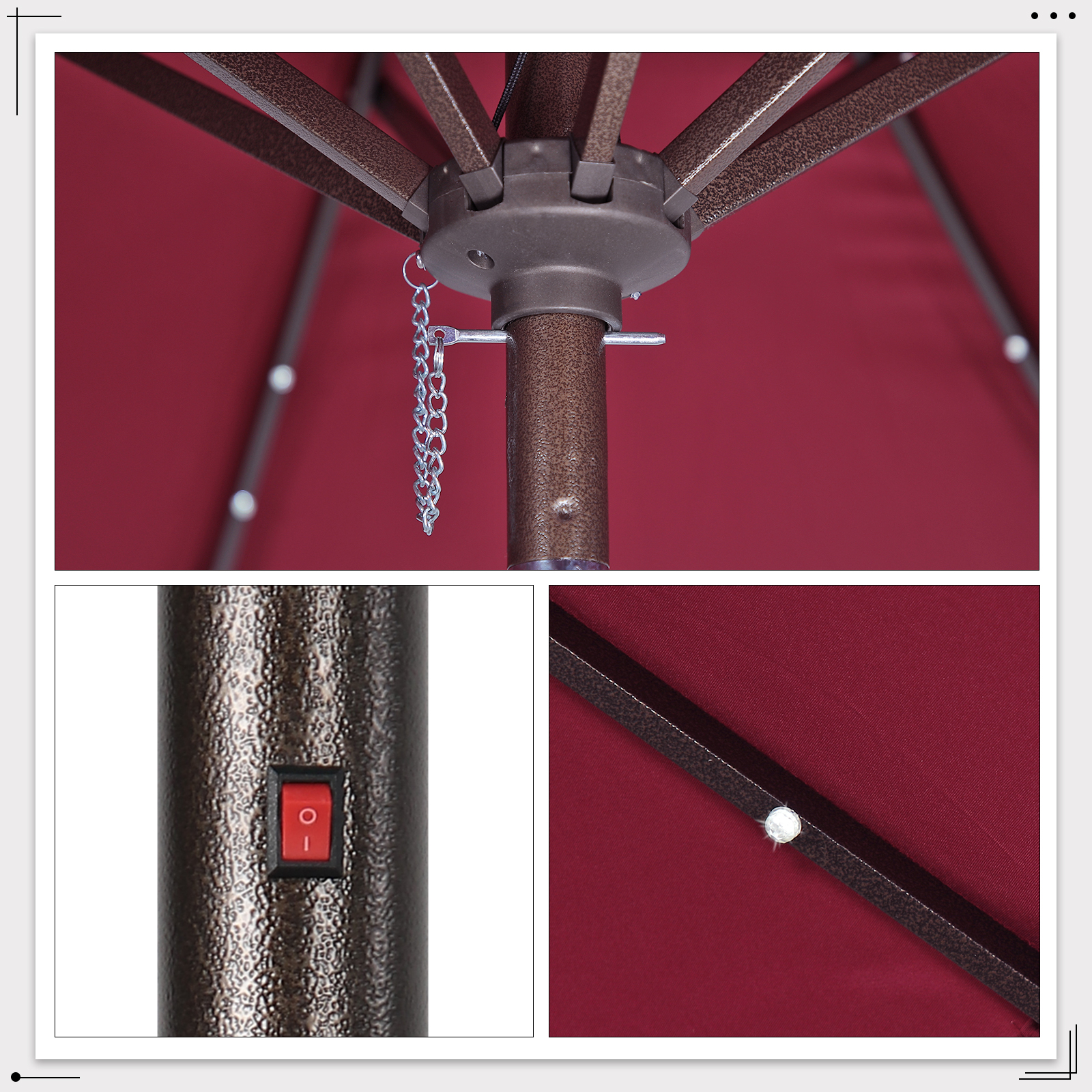 - Solar Powered Umbrellaļ¼ Crafted with 32 built-in LED lights, 4 LED lights on each rib, 8 ribs construction. There’s also an on/off switch for LED lights, which can be closed during the day and opened to light up a relaxing night and create a warm atmosphere.