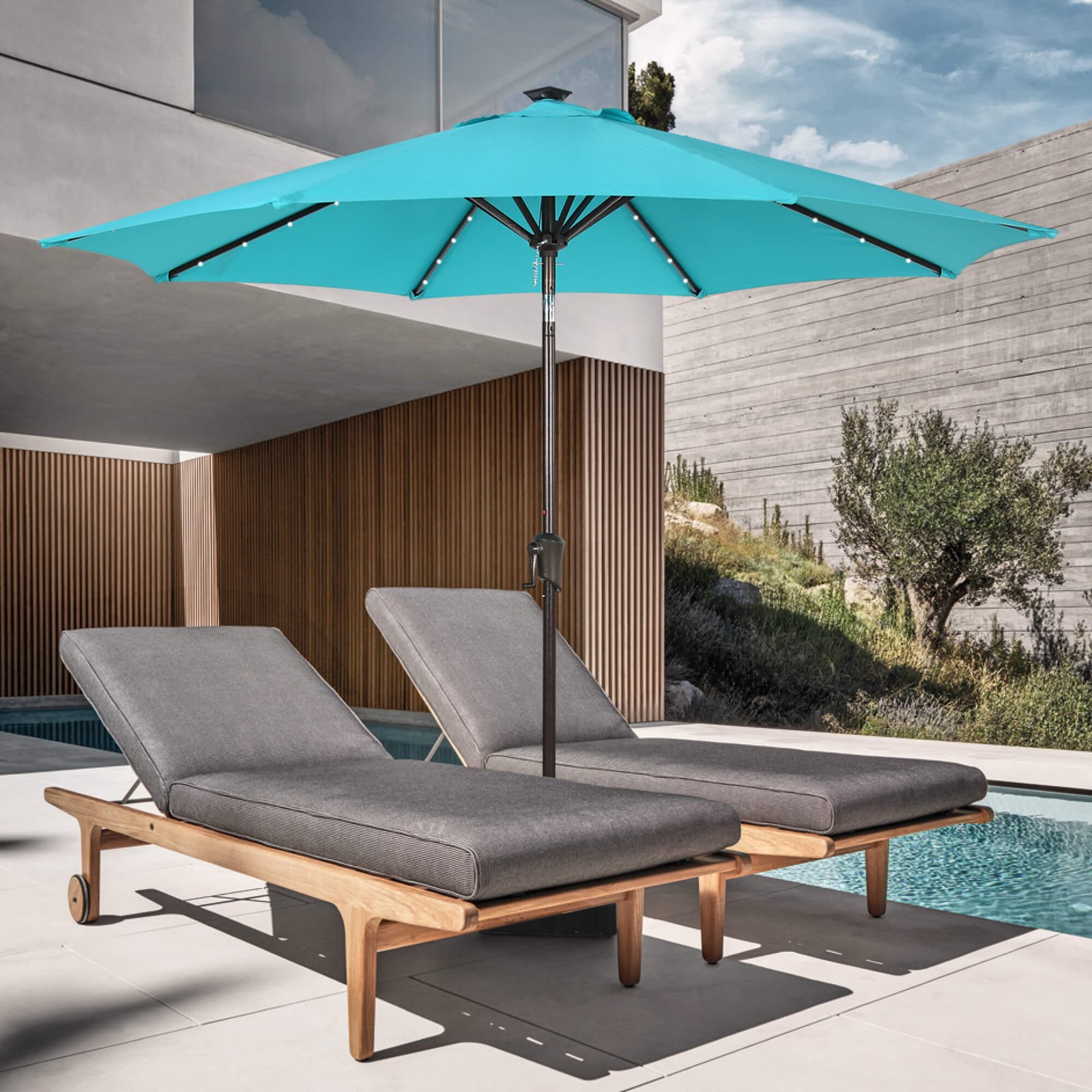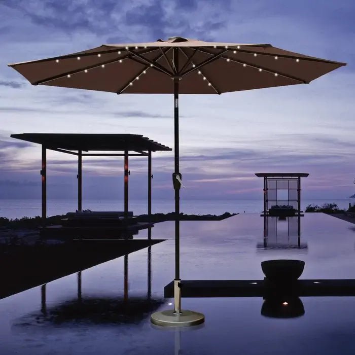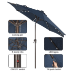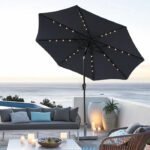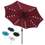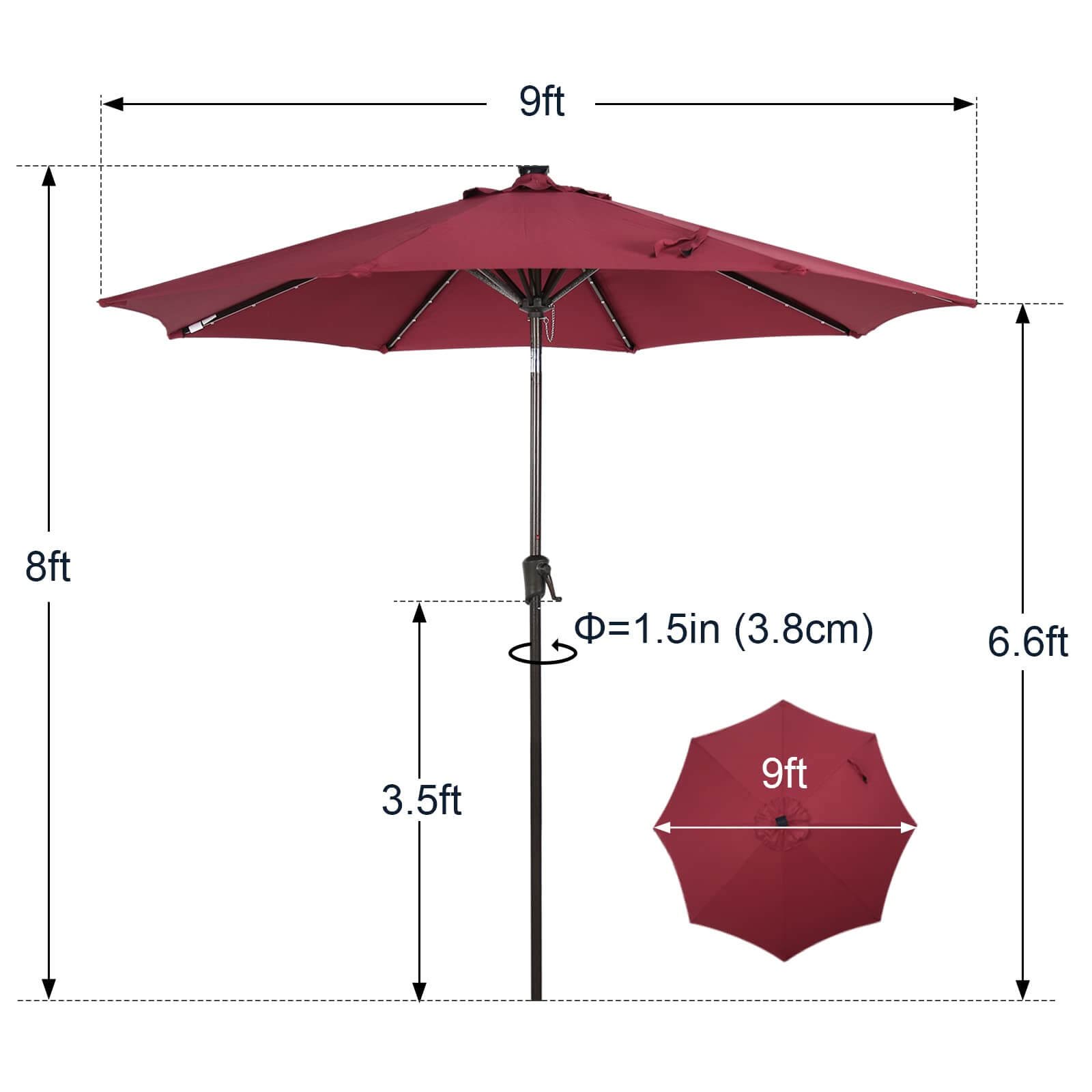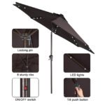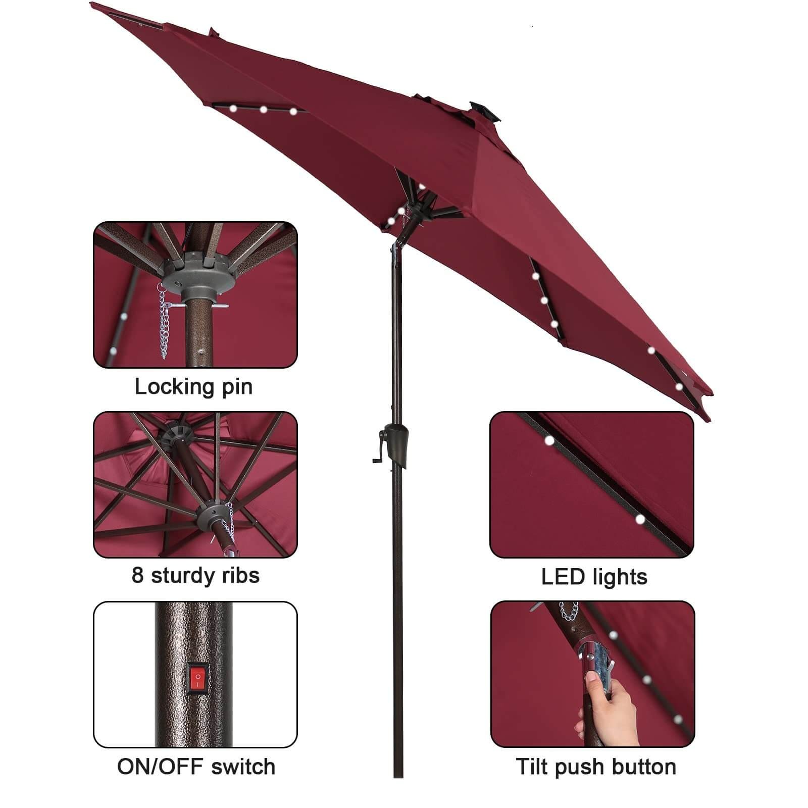 - Solar Powered Umbrellaļ¼ Crafted with 32 built-in LED lights, 4 LED lights on each rib, 8 ribs construction. There’s also an on/off switch for LED lights, which can be closed during the day and opened to light up a relaxing night and create a warm atmosphere.