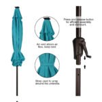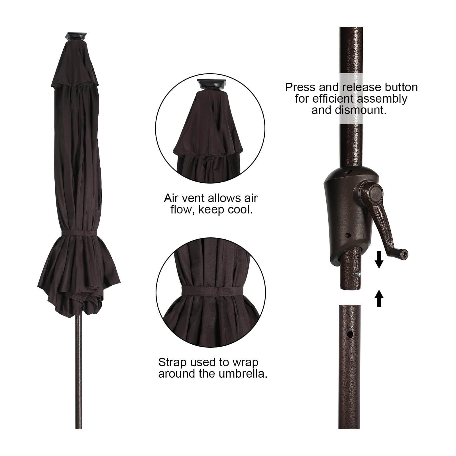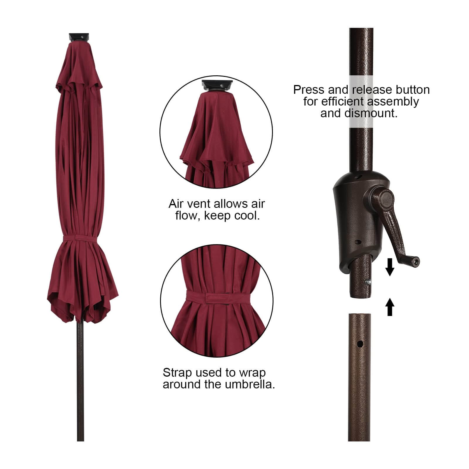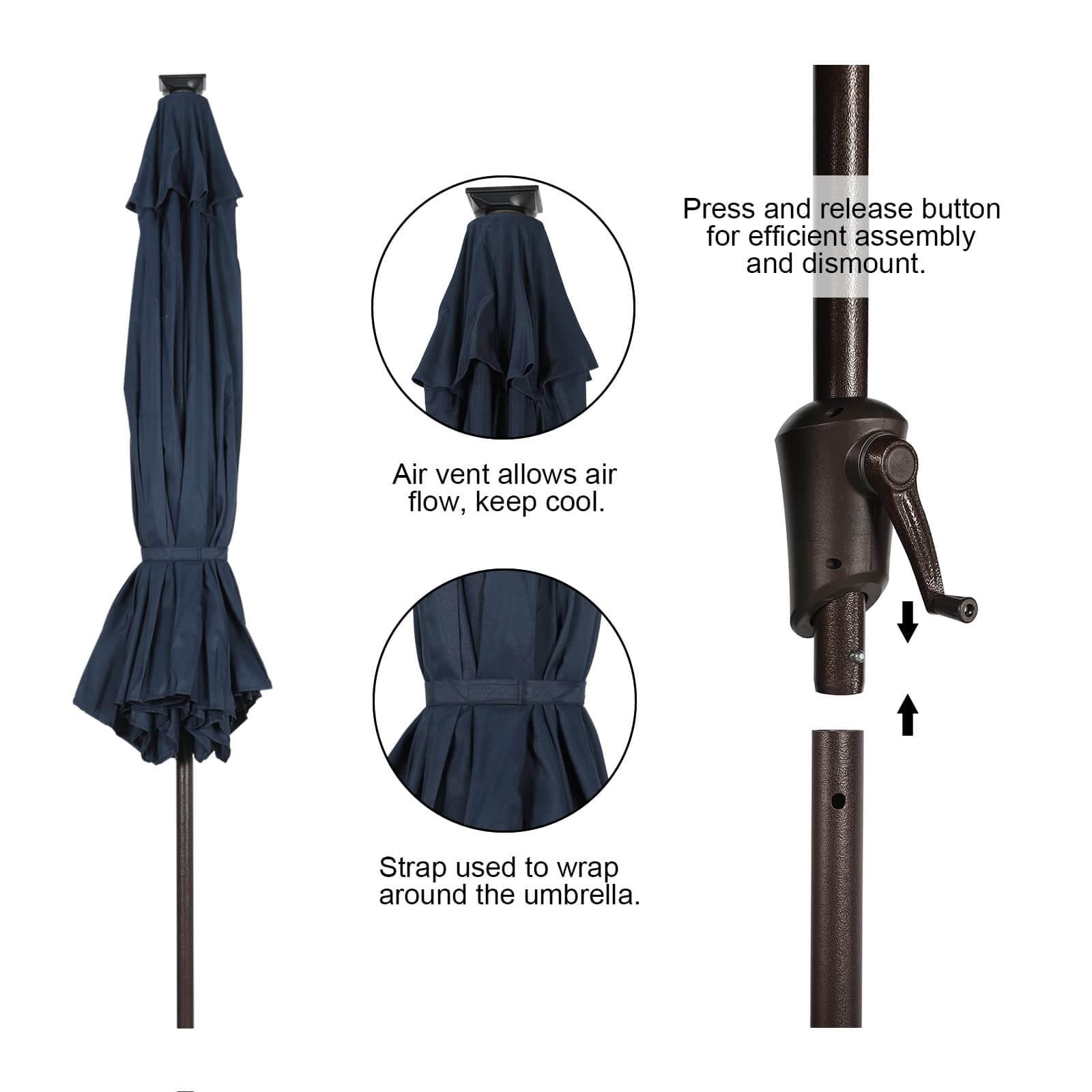 - Convenient Tilt & Crank Systemļ¼ Our patio umbrella is easy to open and close by the crank handle. The tilt function adjusts up to 45 degrees, pressing the push button can adjust it according to the sun position, while a wind vent cools air under the umbrella.