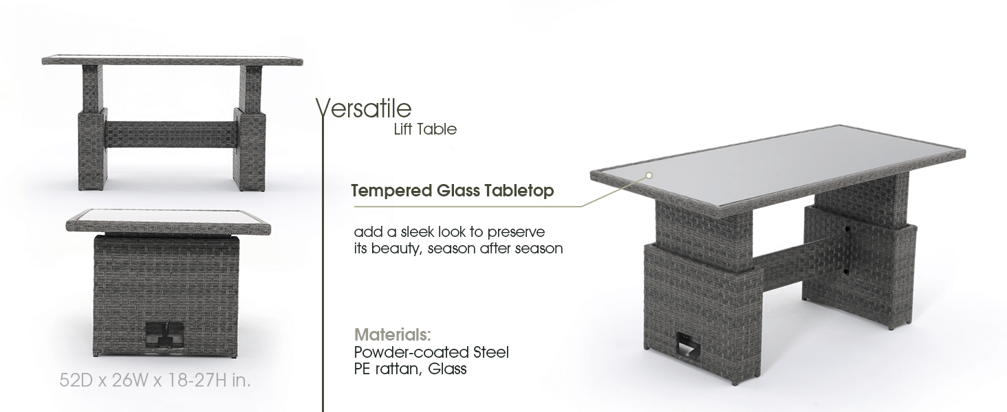 FUNCTIONAL LIFT TABLE – This outdoor furniture set contains an adjustable height table that can easily and quickly rise to the perfect dining level to have a summer barbecue, or cocktail party, or convert to a coffee table sitting out enjoying coffee with ease.